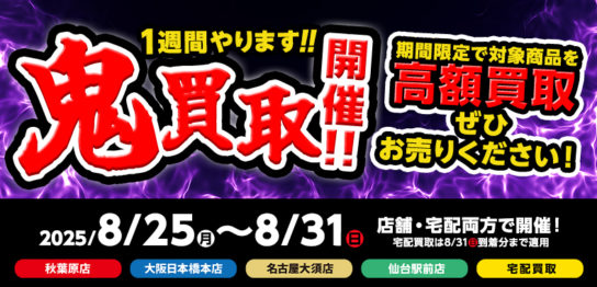 期間限定で対象商品の査定額が大幅アップいたします!期間は8/25~8/31まで!