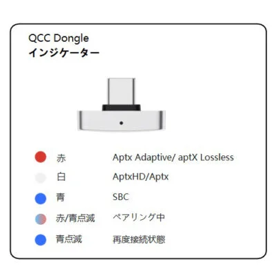 QCC Dongle | QCC Dongle Proのステータスインジケーターは、デバイスの接続状況やコーデックのモードを分かりやすく表示します。