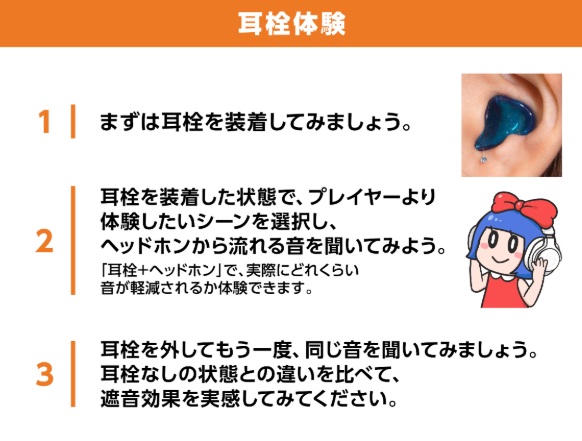 耳栓体験コーナーでは、以下の流れで気軽に耳栓を試すことができます。