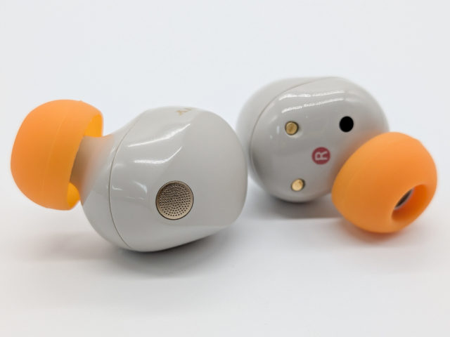 実物に触れてみると他のイヤーピースと比較して耳に触れる部分が薄手の造りで柔らかい素材を採用しています。加えてステムの部分が短めなので他のイヤーピースと比べると耳の浅い部分で収まる装着感のタイプだと言えるでしょう。良好な装着感ですね。