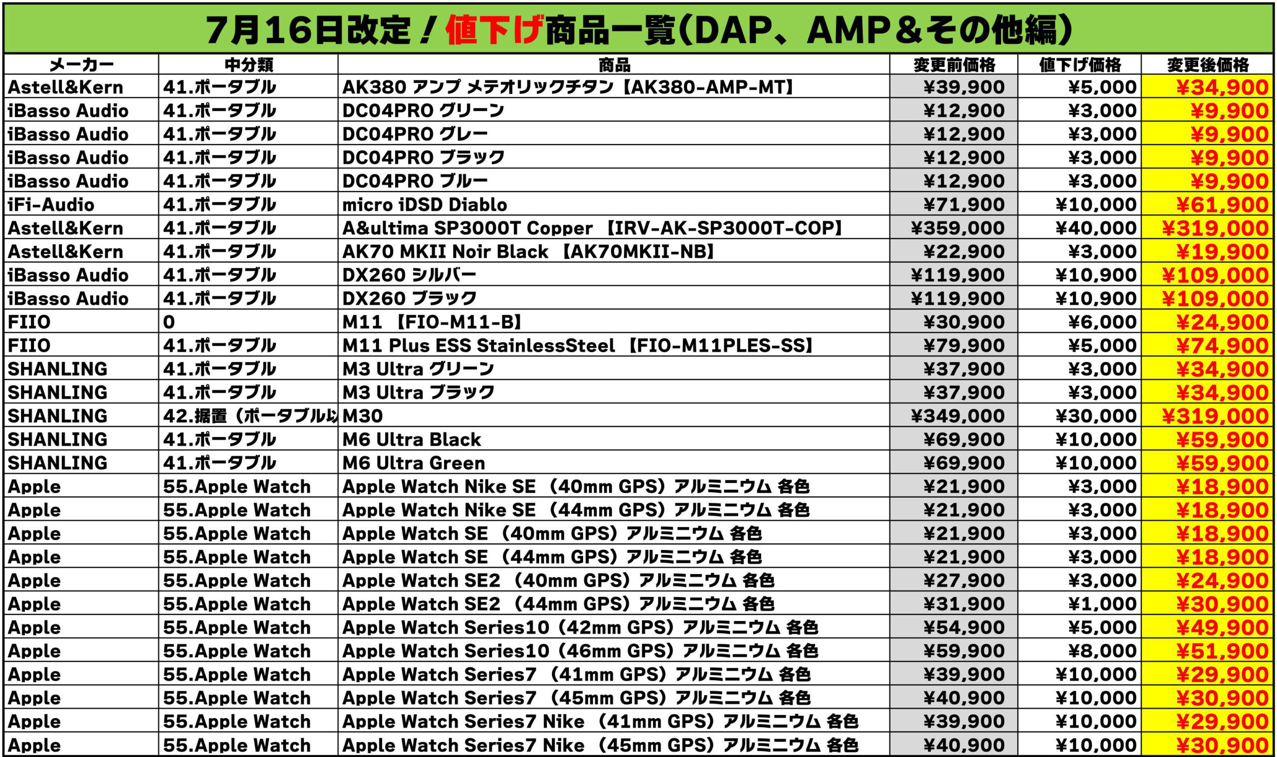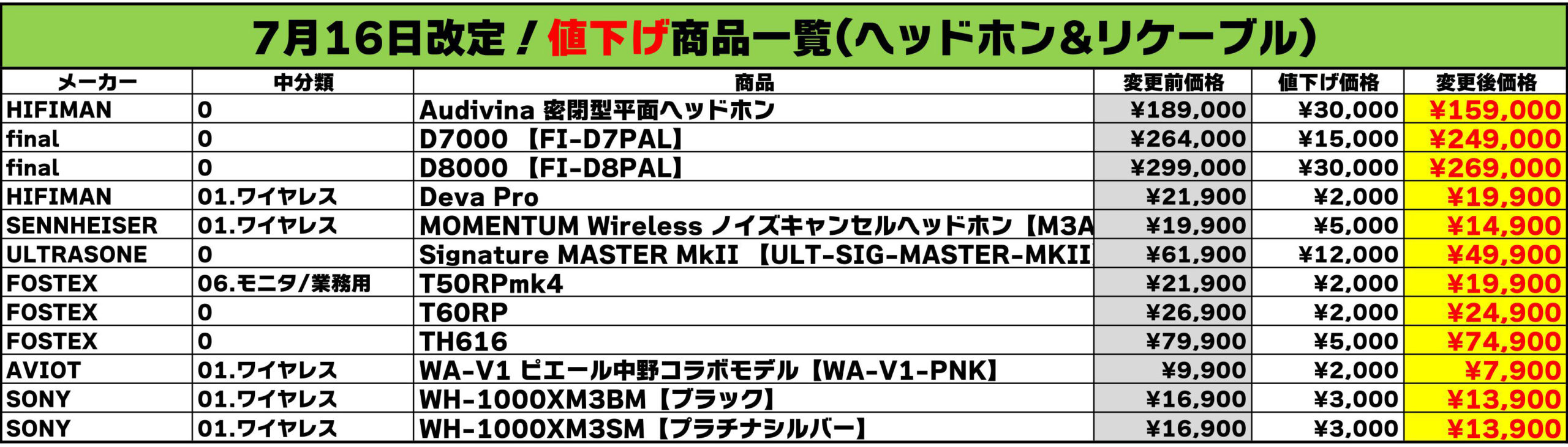 今回値下げされた製品一覧