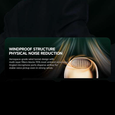 マイクポートの⾓度設計が⾵を分散し、強⾵下でも安定した⾳声⼊⼒を実現