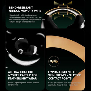 NITINOL(形状記憶合⾦)フレームが⽿の付け根を⾃動でホールドし、3Dバイオメトリック形状により、95%の⽿型に⾃然にフィットします。