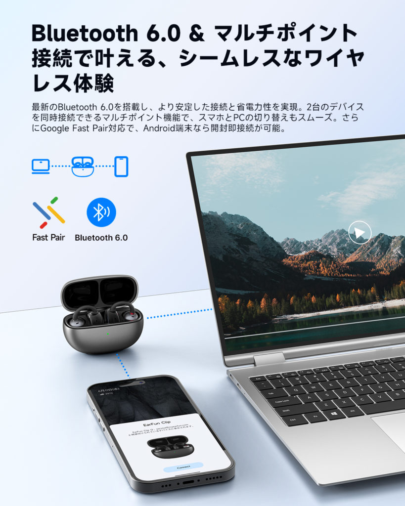 最新のBluetooth 6.0を搭載し、より安定した接続と省電力性を実現。