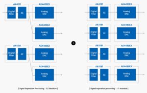 AK4191EQデジタルプロセッサー1基とAK4499EX DAC 1基が対になるこの新構造により、ノイズを分散させることなく、デジタル信号を1つのDACに対し正確に届けることができ、信号の分離と処理の向上が可能になりました。
