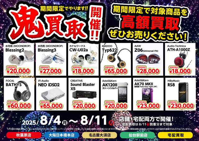 イヤホン売るなら買うならe☆イヤホン!使わなくなったオーディオ機器、眠らせたままになっていませんか?今回の記事では期間限定で開催されるお得な買取キャンペーン情報をお届け。週替わりでラインナップが変わる“鬼買取“今週の高価買取対象アイテムをご紹介しますぞ!