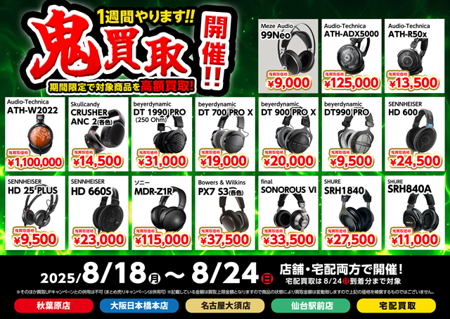 イヤホン売るなら買うならe☆イヤホン!使わなくなったオーディオ機器、眠らせたままになっていませんか?今回の記事では期間限定で開催されるお得な買取キャンペーン情報をお届け。週替わりでラインナップが変わる“鬼買取“今週の高価買取対象アイテムをご紹介しますぞ!