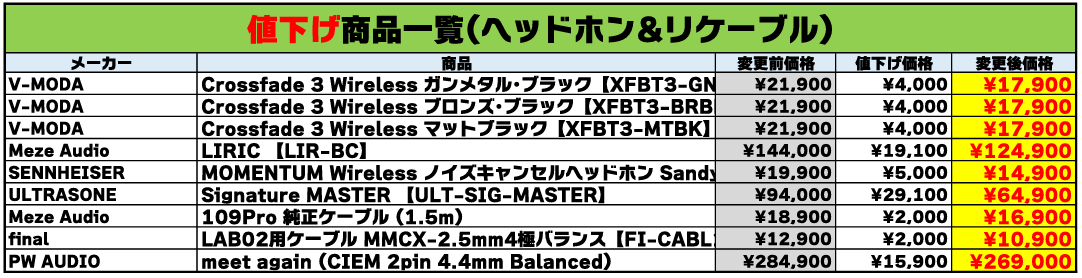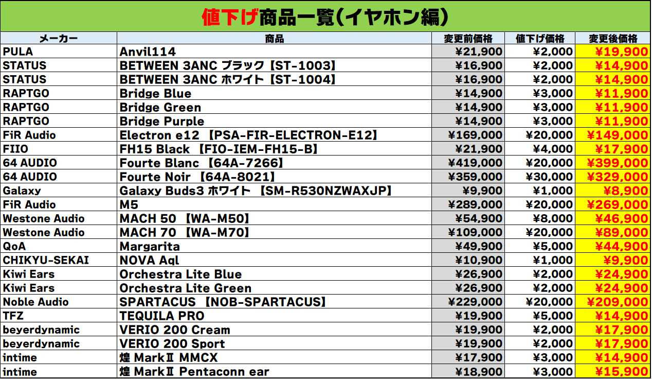 イヤホン売るなら買うならe☆イヤホン!この記事では毎回週1ぐらいのペースで更新している、中古商品の最新値下げ情報をお届けいたします。