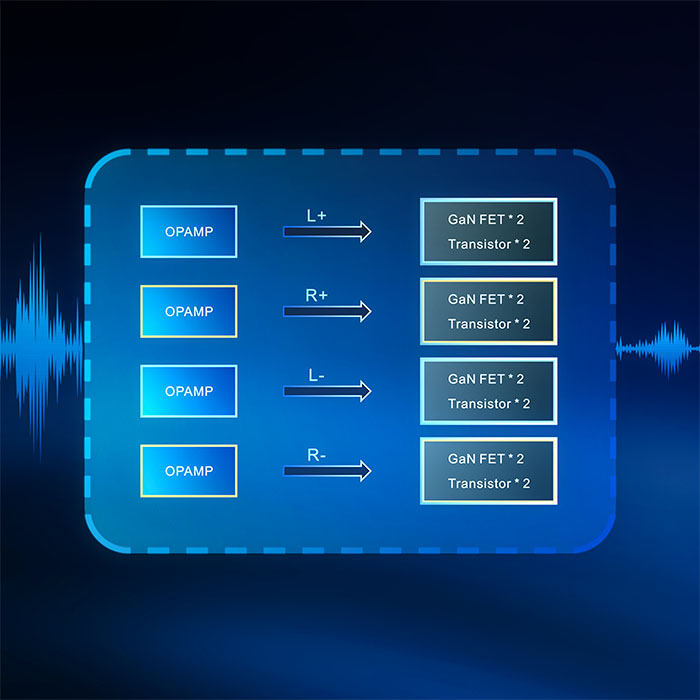 従来のヘッドホンアンプ方式と比べ、窒化ガリウム部品を採用し最適化されたGaN回路は、インダクタンスを小規模化することに成功しています。