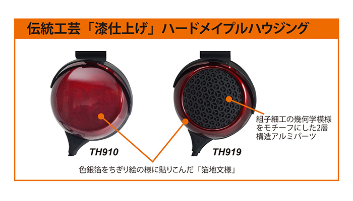 ハードメイプルの無垢材ハウジングは、日本の伝統工芸を工業製品に活かす創業1900年(明治33年)の「株式会社坂本乙造商店」が独自に開発した漆工芸で仕上げています。黒漆を基層とし硫黄でいぶした色銀箔をちぎり絵の様に貼りこんだ「箔地文様」は、高級感溢れる格調高い奥行き感を表現します。硬質で比重が高いハードメイプルは漆仕上げの硬い塗膜と相まって音に不要な色付けをせず、しっかりとした深みのある低音域からクリアで伸びやかな高音域をお楽しみいただけます。オープン型のTH919は、ハウジング開口部に組子細工の幾何学模様をモチーフにした艶消しアルマイトで仕上げのアルミ材を採用、レーザーカットによるメッシュ加工の精密な2層構造とし開口率と各内部パーツを綿密に調整することで、オープン型に相応しい解像度が高く聴き疲れしにくい自然な音場を再現します。