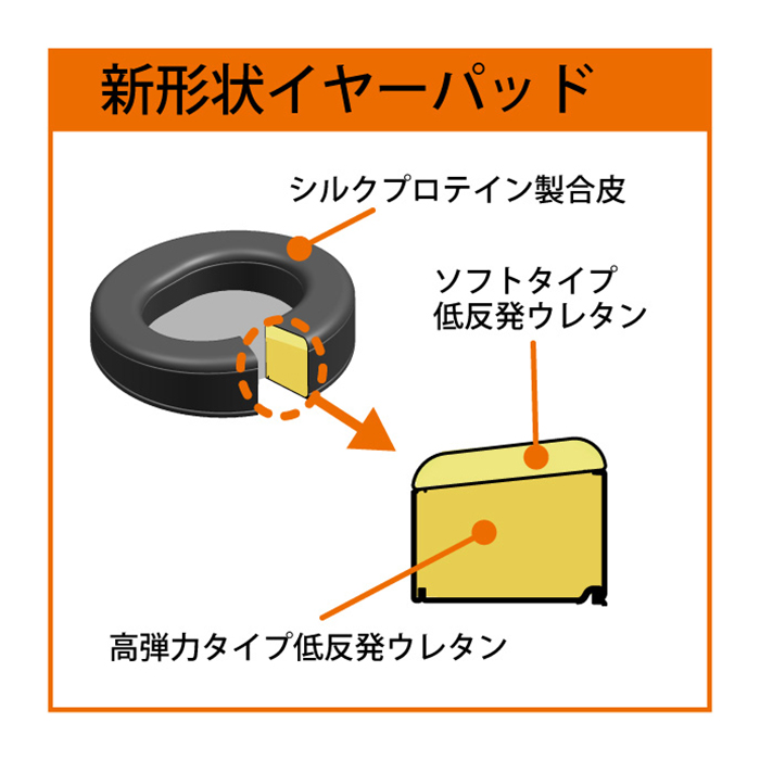 新形状のイヤーパッドは顔に当たる面を傾斜させた形状で装着感を最適化。内部の低反発ウレタンは2層構造とし顔の形状にフィットするよう柔らかいタイプを表側、高弾力タイプを内側に配置したことに加え、従来比3倍に耐久性を高めたシルクプロテイン製合皮の採用により、長時間にわたるリスニングでも快適な掛け心地でお使いいただけます。