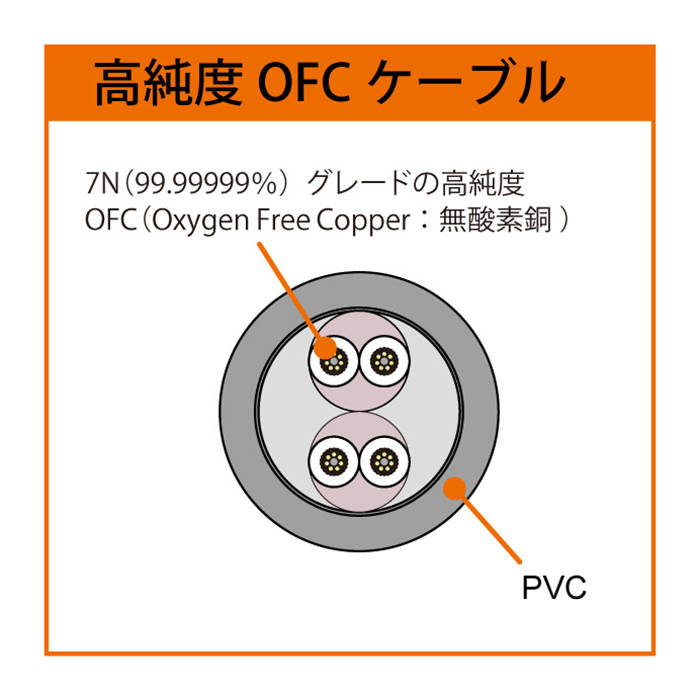 不純物を極限まで排除し伝送能力を高めた7N(99.99999%)グレードの高純度OFC(Oxygen Free Copper:無酸素銅)ケーブルを内部配線材と付属のアンバランス・ケーブルに採用しています。