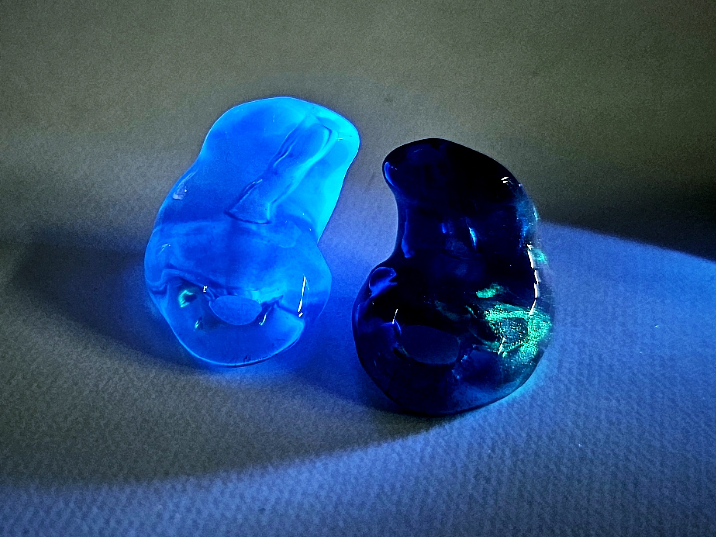 濃いブルーの方には蓄光塗料を入れていてブラックライトで光ります✨