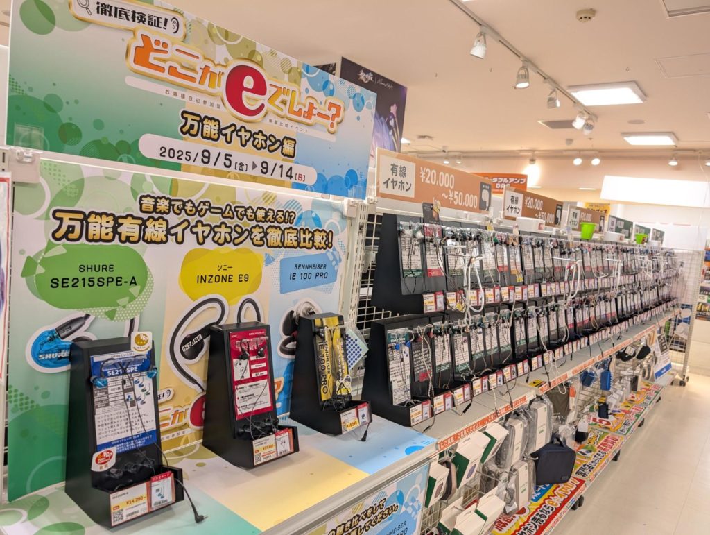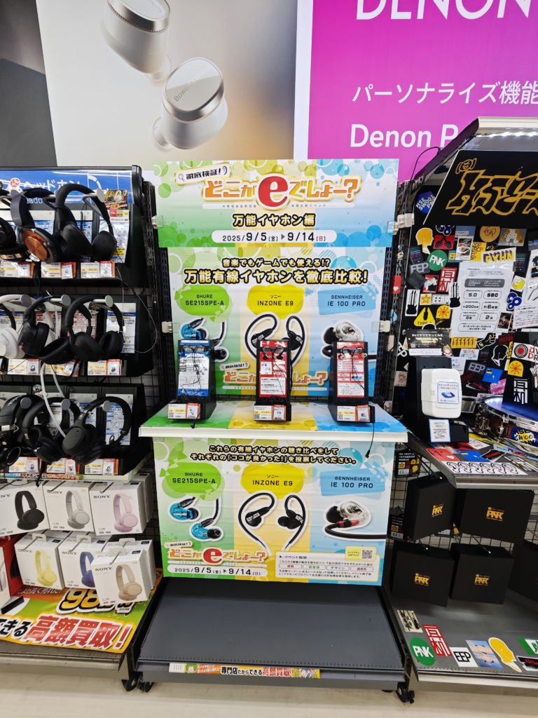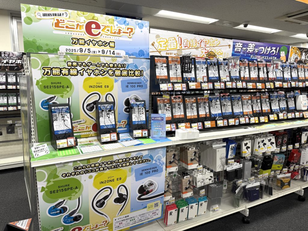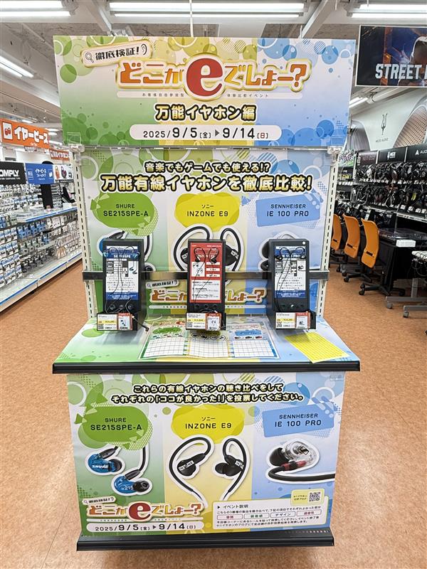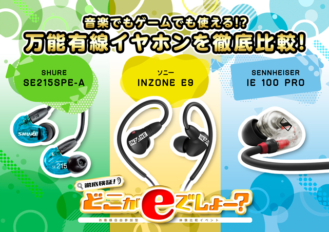 勝利に導くFPS最適なサウンドということで、今回はその実力を徹底比較していきます!!ゲームやeスポーツシーンでは、その音質や装着感の良さから「モニターイヤホン」が多くのプレイヤーに使用されています。ゲームにも、音楽にも使える万能イヤホンをピックアップし、どこがeでしょー?と題しまして各店舗でE9と比較試聴できる特設コーナーを展開します!