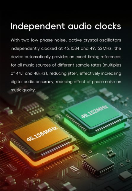 45.158MHzと49.152MHzそれぞれのオーディオソースの専用クロック用の水晶発振器を搭載。ノイズとジッターを低減し極めて制度の高い再生を実現。