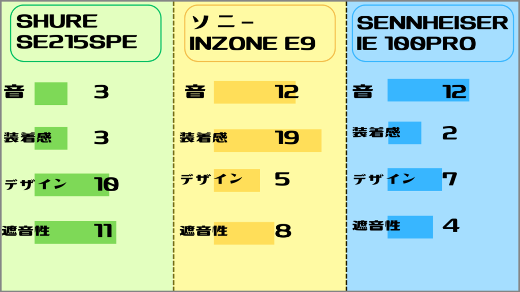 こんなに表がばらけるとは….!!!比較しがいがありますね🔥SE215では遮音性・E9では装着感・IE100PROでは音が特に支持されてるようです!!