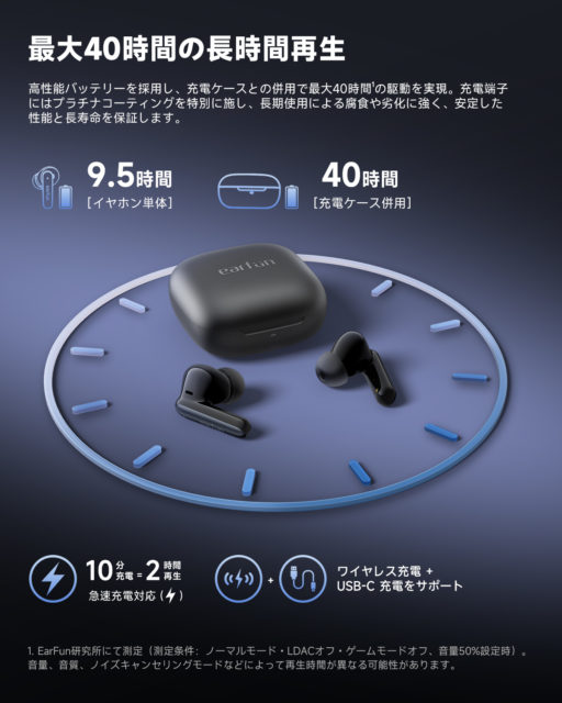 イヤホン単体で最大9.5時間、充電ケースと合わせればトータル40時間まで音楽を楽しめます。忙しい朝でもわずか10分の充電で2時間再生できる、急速充電に対応。