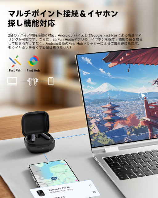 さらに、EarFun Audioアプリの「イヤホンを探す」機能で音を鳴らして探せるだけでなく、Android最新のFind Hubトラッカーによる位置追跡にも対応。もうイヤホンを失くす心配はありません!