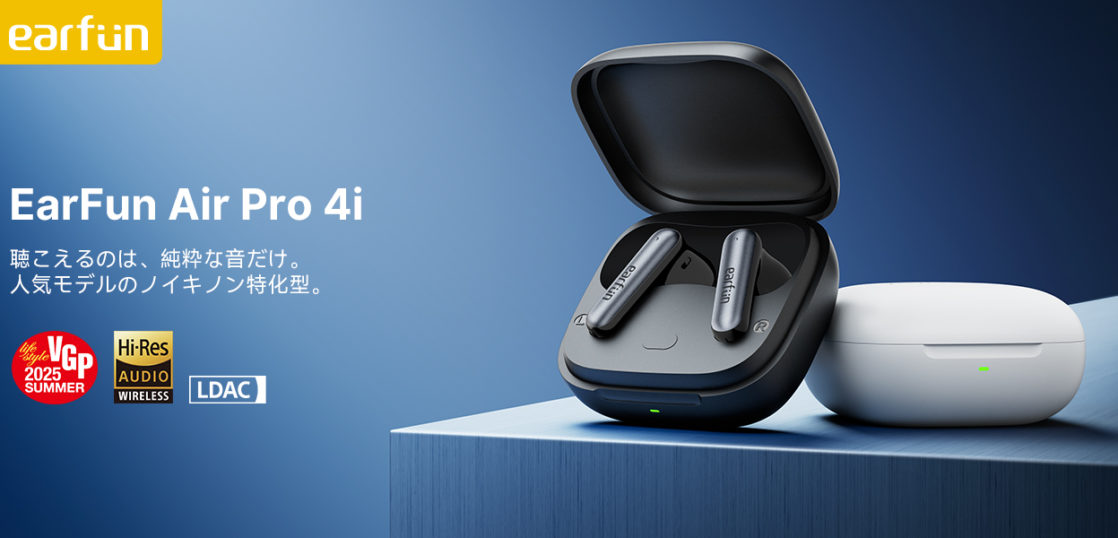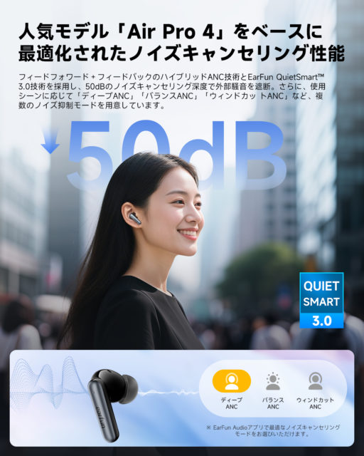 人気モデル『EarFun Air Pro 4』をさらに進化させた『EarFun Air Pro 4i』は、ハイブリッドANCと独自のANC技術『QuietSmart 3.0』を搭載。