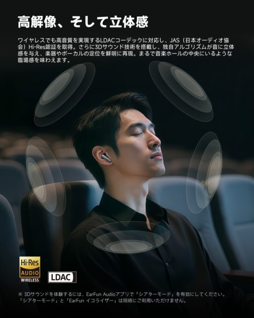 LDAC対応でハイレゾ級ワイヤレス音質を実現し、日本オーディオ協会のHi-Res認証を取得。さらに3Dサウンド技術により、楽器やボーカルの定位が鮮明に再現される立体感あふれるサウンドを体験可能。
