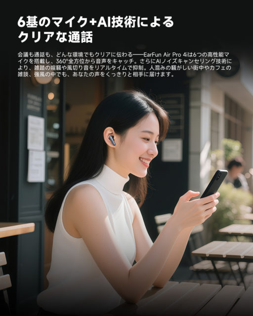 会議中でも通話中でも、クリアに会話ができる――EarFun Air Pro 4iは6つの高性能マイクを搭載し、360°全方位から音声をキャッチ。