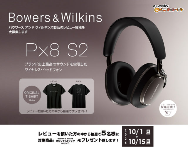 2025年10月1日(水)11:00~2025年10月15日(水)11:00までのキャンペーン期間中、e☆イヤホン オンラインストアにて、『Bowers & Wilkins』製品にレビューをご投稿いただいた方の中から、下記の賞品を抽選で計5名様にプレゼントいたします。
