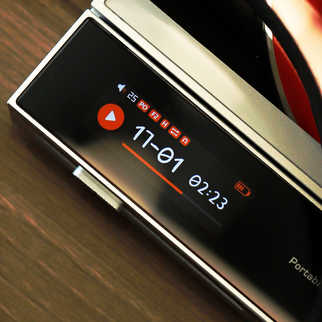 オレンジカラーのレトロデザインUIのスクリーンは、楽曲の再生表示や各種設定項目などをシンプルなレイアウトで表示します。 モード切替時に機能しなくなる各種項目は、ユーザーの誤操作を招かないようにグレーアウト表示されるなど、ユーザビリティに優れた設計となっています。