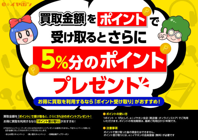 ・買取金額をポイントで受け取るには、e☆イヤホンの会員登録(無料)が必要です。