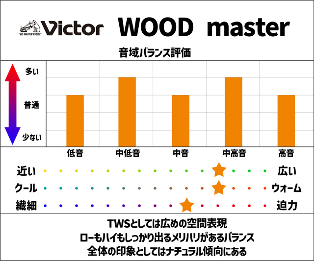 低音は量はそこそこで、幅が広いと思います。胴の深い打楽器のサスティンの深い響きを感じられました。高音部分はシャープでキレがあります。この辺りはもともとVictorの得意な部分かなと思います。個性的なタイプではなく、正統派、優等生といった印象でした。
