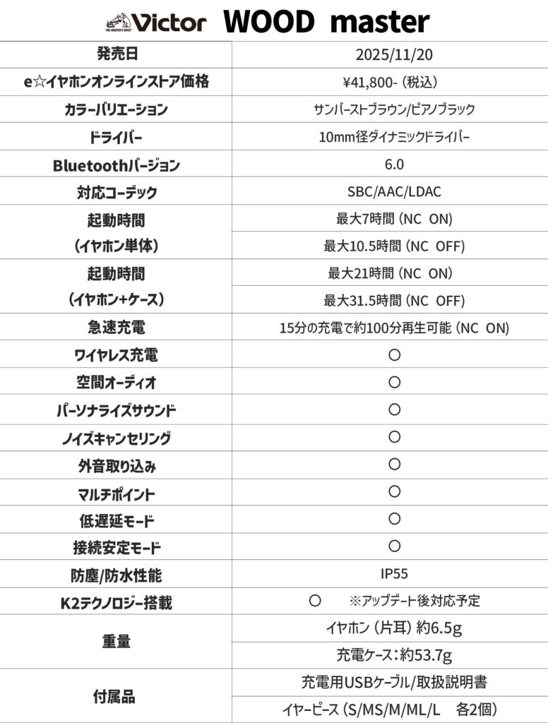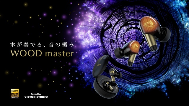 新開発のWOODドライバーを搭載したワイヤレスイヤホンのフラグシップモデル。VICTOR STUDIO監修の「音創り」と「空間オーディオ」に加え、プロのエンジニアがWOOD masterオリジナルに制作した「プロフェッショナルモード」を搭載し、さらに個人の外耳道の音響特性を測定し最適化する「パーソナライズサウンド」の機能も搭載。発売後のアップデートの予定では、CDやストリーミングなどのハイレゾ非対応コーデックによる伝送時においても、ハイレゾ相当まで拡張して原音に近づける高音質化技術「K2テクノロジー」を搭載予定とのこと。