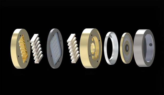 スピーカーハウジングの材質には真鍮とステンレスを併用しており、サファイアクリスタルのフェイスプレートからパッシブラジエーターをご確認いただけます。