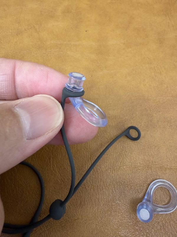 本体の先端にコネクターコードを通し、その後本体にイヤピースを装着します。