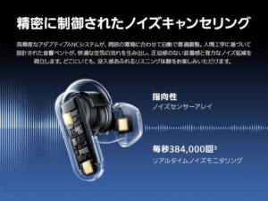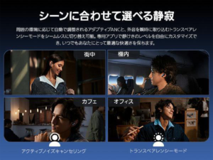 周囲の環境に応じて自動で調整されるアダプティブANCと、外音を瞬時に取り込むトランスペアレンシーモードをシームレスに切り替え可能。