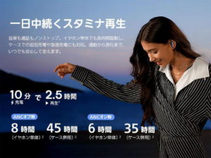 イヤホン単体でも長時間駆動し、ケースでの追加充電や急速充電にも対応。