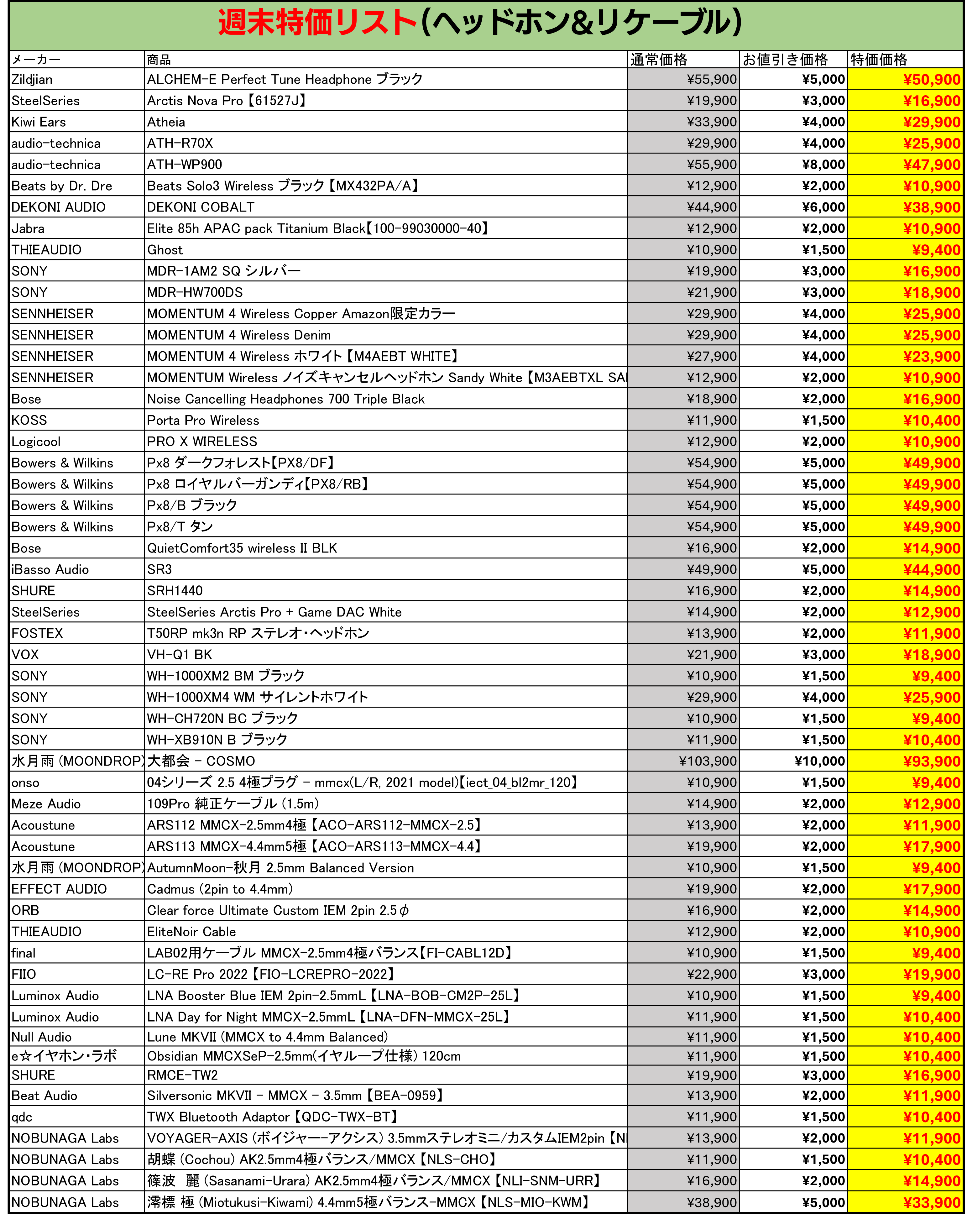 週末特価対象製品一覧