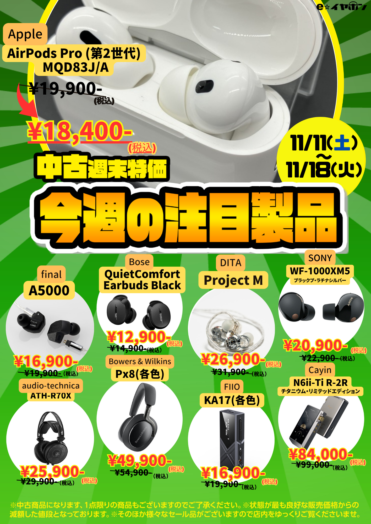 イヤホンを売るなら買うなら、e☆イヤホン!お得な中古週末特価情報をご案内します。今回も実店舗とオンラインストアの両方で、中古週末特価セールを開催いたします!