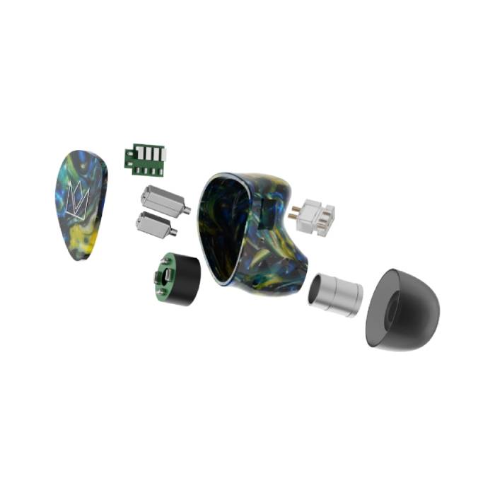 Van Goghは、ゴッホの《星月夜》にインスパイアされ、宇宙の深みと音楽の流れを融合させています。深みのある低音、層のある中音域、そして疲れを感じさせないクリーンで空気感のある高音域。映画音楽の繊細な空間から現代音楽の濃密なサウンドまで、Van Goghは没入感と感情、そして生命力を感じさせるようにチューニングされています。このチューニングの核となるのは、特注のハイブリッド構成4ドライバーです。Nobleのデュアルマグネティック回路・マグネシウム/アルミニウム振動板搭載8mmダイナミックドライバーに加え、SonionとKnowles製の高品質BAドライバー3基を組み合わせています。その結果、スピード感と存在感のある豊かで立体的なサウンドが生まれ、音楽性と魂を重視したチューニングが施されています。各フェイスプレートは、ゴッホの絵画の動きと混沌を反映した渦巻き模様で手作業により仕上げられており、同じものは二つと存在しません。樹脂製シェルは自然なフィット感を追求して造形されており、長時間の装着でも快適で、外出時やスタジオでの使用に適した優れたパッシブアイソレーションを提供します。カスタムIEM 2pinコネクター、4.4mmバランスプラグ搭載のNoble製8芯OCCケーブルが付属します。