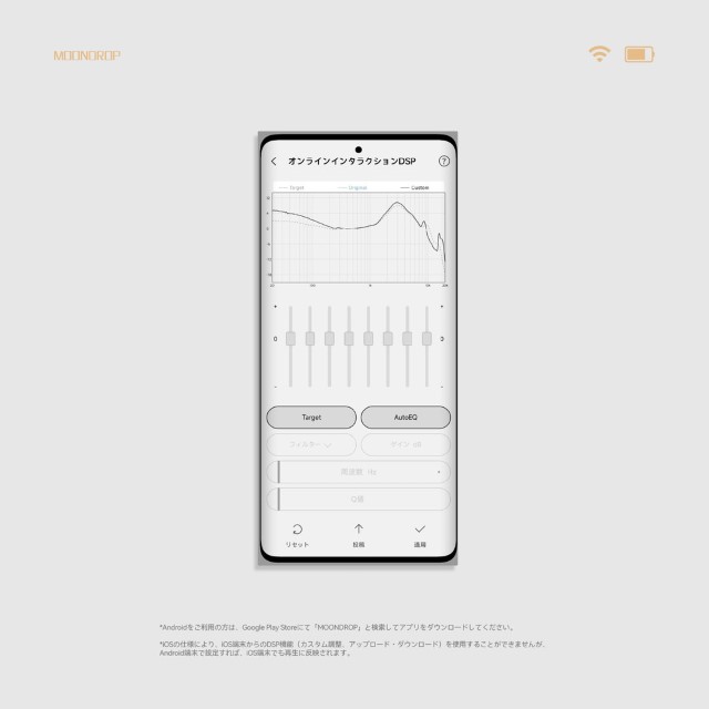 最新の公式アプリ「ios:MOONDROP GLOBAL Andriod:MOONDROP」を使えば、ユーザーはMarigold(マリーゴールド)のサウンドカードチップ内蔵DSPパラメトリック EQを最新のチューニングインターフェースでより正確かつ簡単にカスタマイズできます。