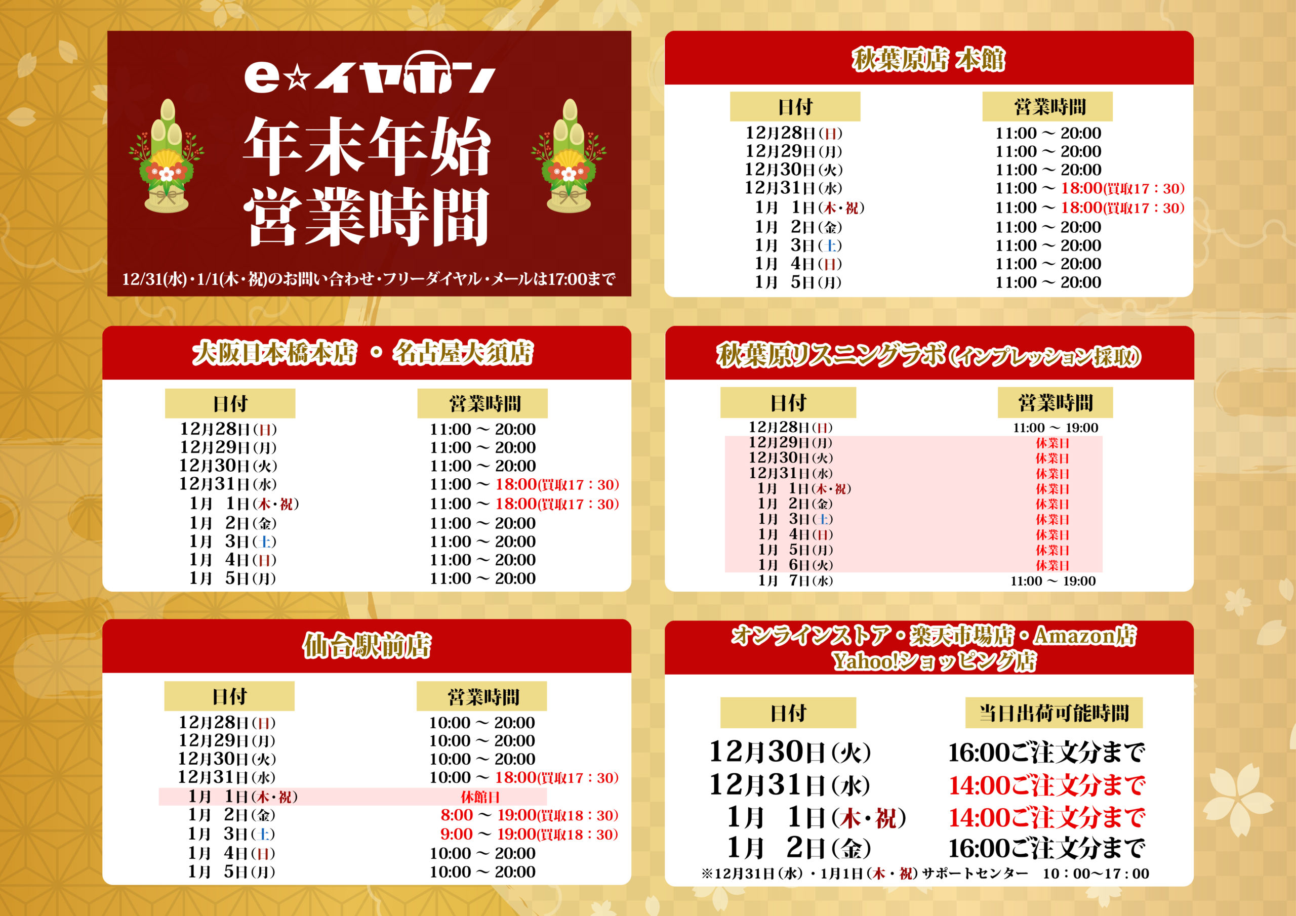 本日はe☆イヤホン各店の年末年始営業時間のお知らせの為にやってまいりました。