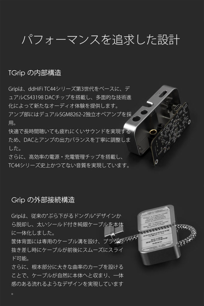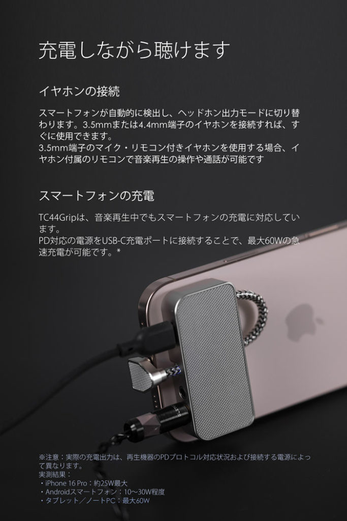 TC44Grip はスマートフォンで有線イヤホンを楽しむためのガジェットとして従来からあるポータブル・ドングルタイプの DAC アンプの新しい形としてddHiFi が提案するもので、スマートに、且つ便利にお使い頂けるようにスマートフォンの背面に取り付けることができ、また配線も非常にすっきりとおさまる“こういうのあったらいいな”を体現しています。