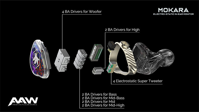 Mokaraは、バランスドアーマチュアと静電技術を融合させた、片側18基ものドライバーを誇る7way・クロスオーバー構成を採用しています。この高密度な設計により、