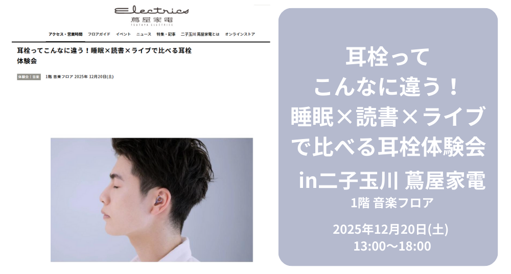 耳栓には、静かな睡眠を助けるタイプ、集中力を高める読書向け、音を楽しみながら耳を守るライブ向けなどの種類があります。本イベントでは、4種類の耳栓を販売しながらシーン別に“聞こえ方の違い”をその場で体験いただけます。普段の生活が少しラクになる、自分にちょうどいい耳栓を見つけるきっかけに、ぜひお立ち寄りください。