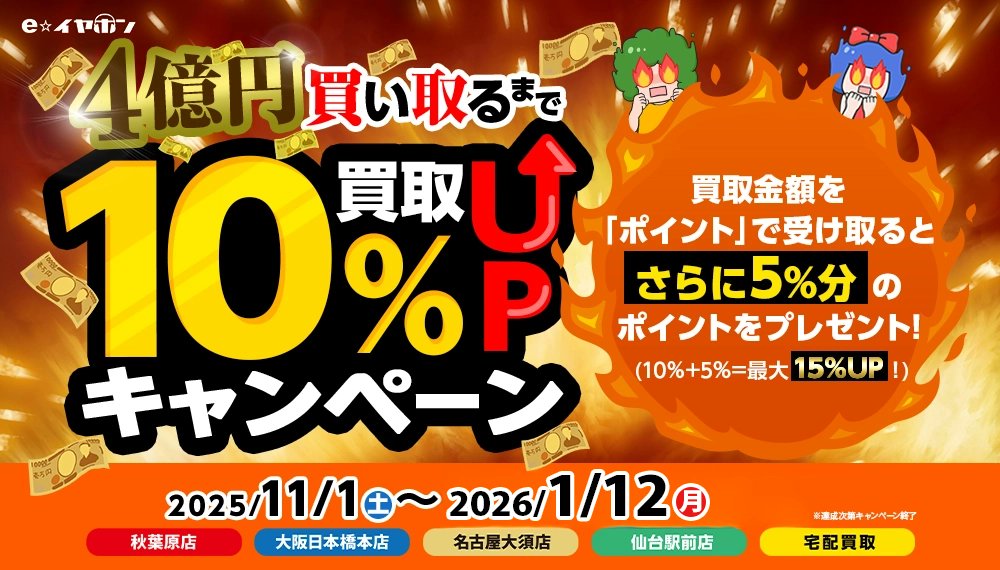 現在大好評開催中の4億円買い取るまで査定金額10%アップキャンペーンですが、2026年1月12日(月・祝)で終了することが決定いたしました。