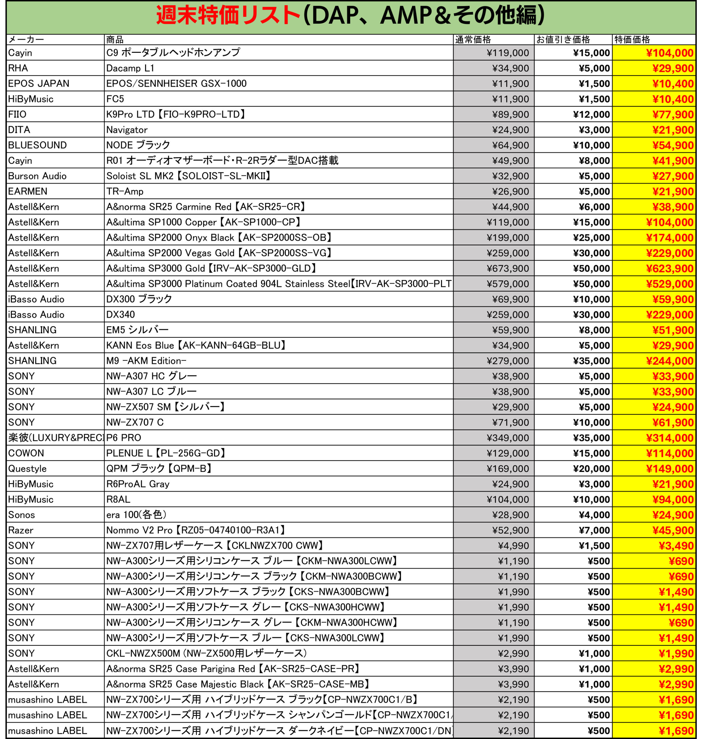 通常の週末特価とは別に「秋葉原店限定特価」として、ここだけの特別ラインナップをご用意しました。 SP3000やMASONといった憧れの名機から、マニア心をくすぐるリケーブルまで。ガッツリ値引きした、掘り出し物の宝庫になっています。衝撃ラインナップをお店に行ってお確かめください…!