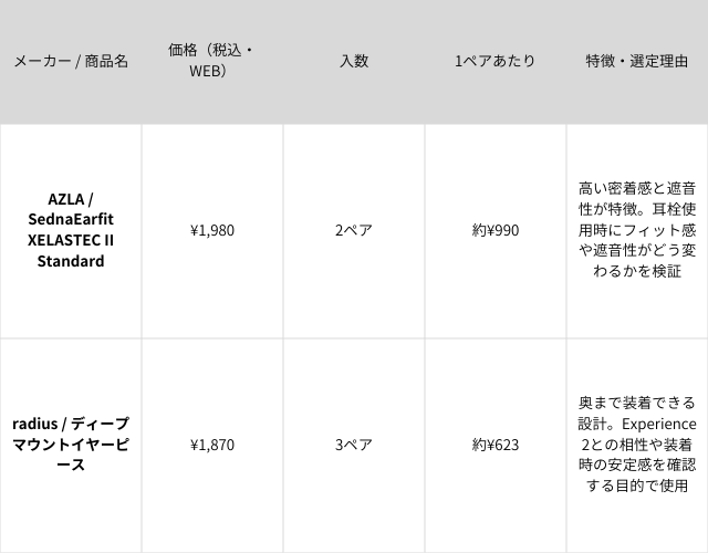 試行錯誤を重ねた結果、実際にほかの耳栓でも使用されている、こちらの2種類のイヤピースに絞って比較を行っています。