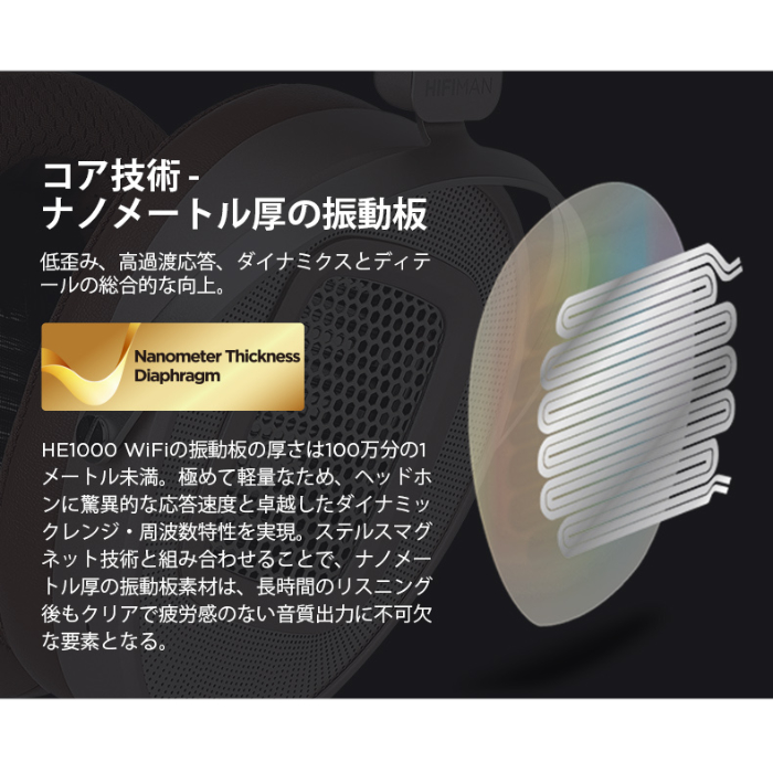 HE1000 WiFiで採用した振動板は、ナノメートル単位の薄さを誇ります。これはHIFIMANが開発した画期的な中核技術です。その薄さを実感いただくために例えるなら、横から見た場合、肉眼では認識できないほどです。この先進素材の加工は極めて困難ですが、HE1000 WiFiの平面ドライバーとしてこの薄膜を成功裏に組み込んだことが、その卓越した音質の礎となっています。