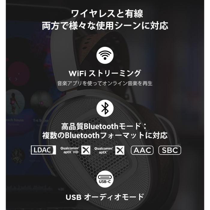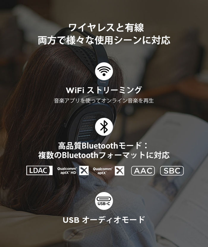 WiFiストリーミングモード、高品質Bluetoothプロファイル、USBオーディオモードに対応したオールインワンのオーバーイヤー型ヘッドホンです。屋外、屋内、ワイヤレス、有線使用など様々なシーンで活躍できます。