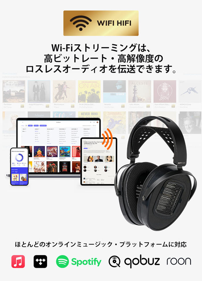 Bluetoothチップは音声処理をも担当し、MP3と同等というそのデータ量では、高品質ストリーミングの膨大なデータ要求を満たすことができない。Wi-Fiストリーミングは、高ビットレート・高解像度のロスレスオーディオを伝送できます。 HE1000 WiFiヘッドホンは、フロントエンド機器やデバイスの電源、伝送ビットレート、インピーダンスマッチング、再生機器からの距離などの複雑な心配は不要であり、ただゆったりと音楽を楽しむことができます。