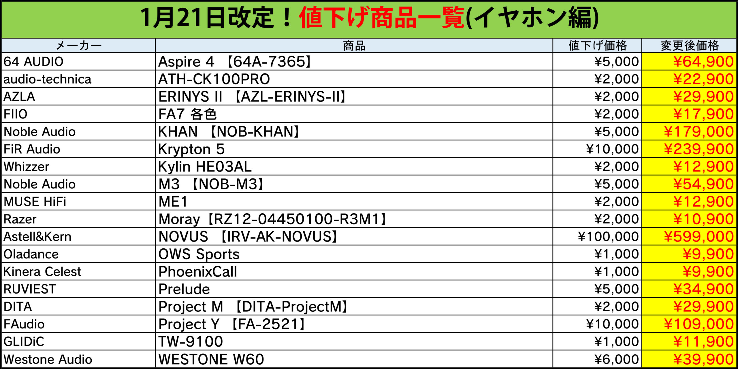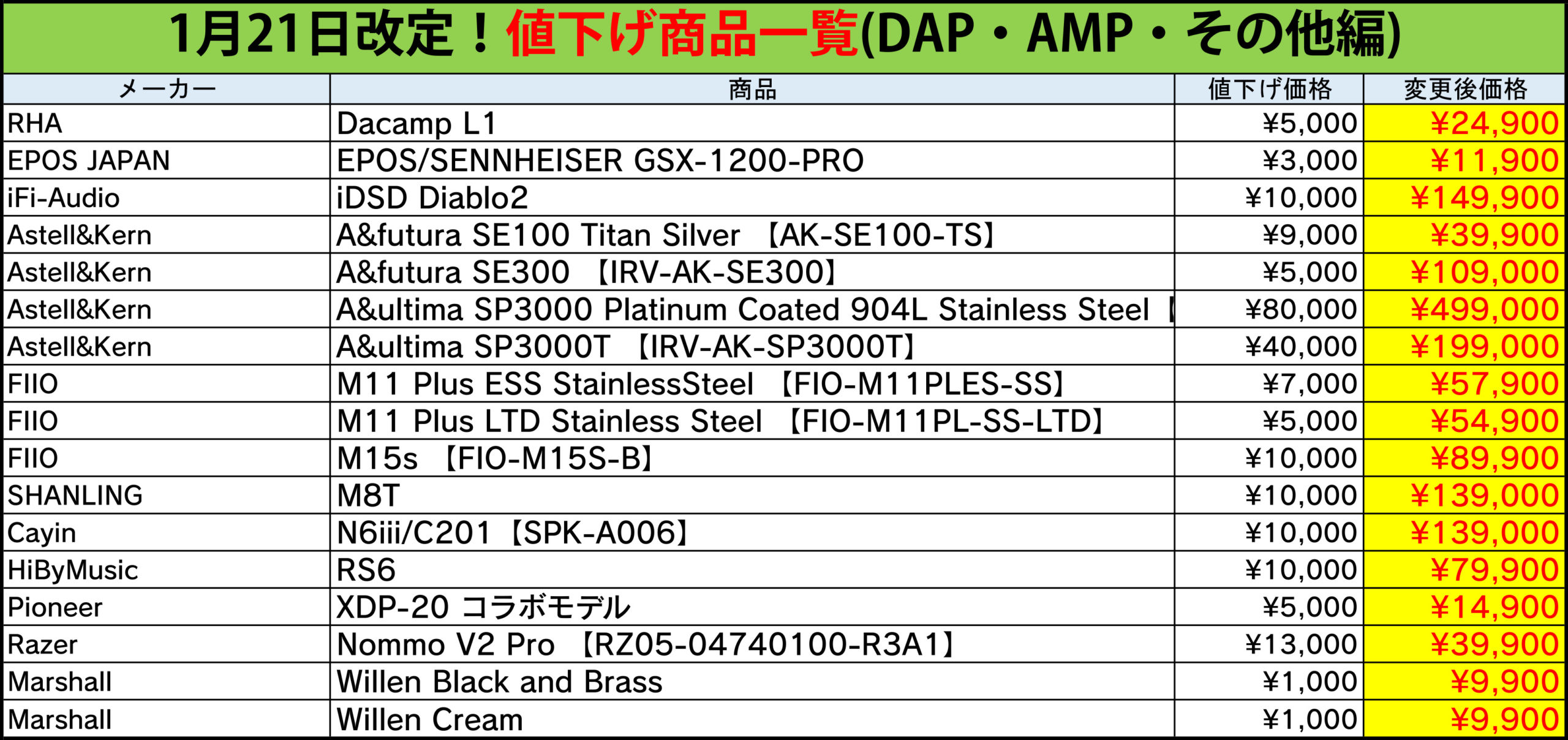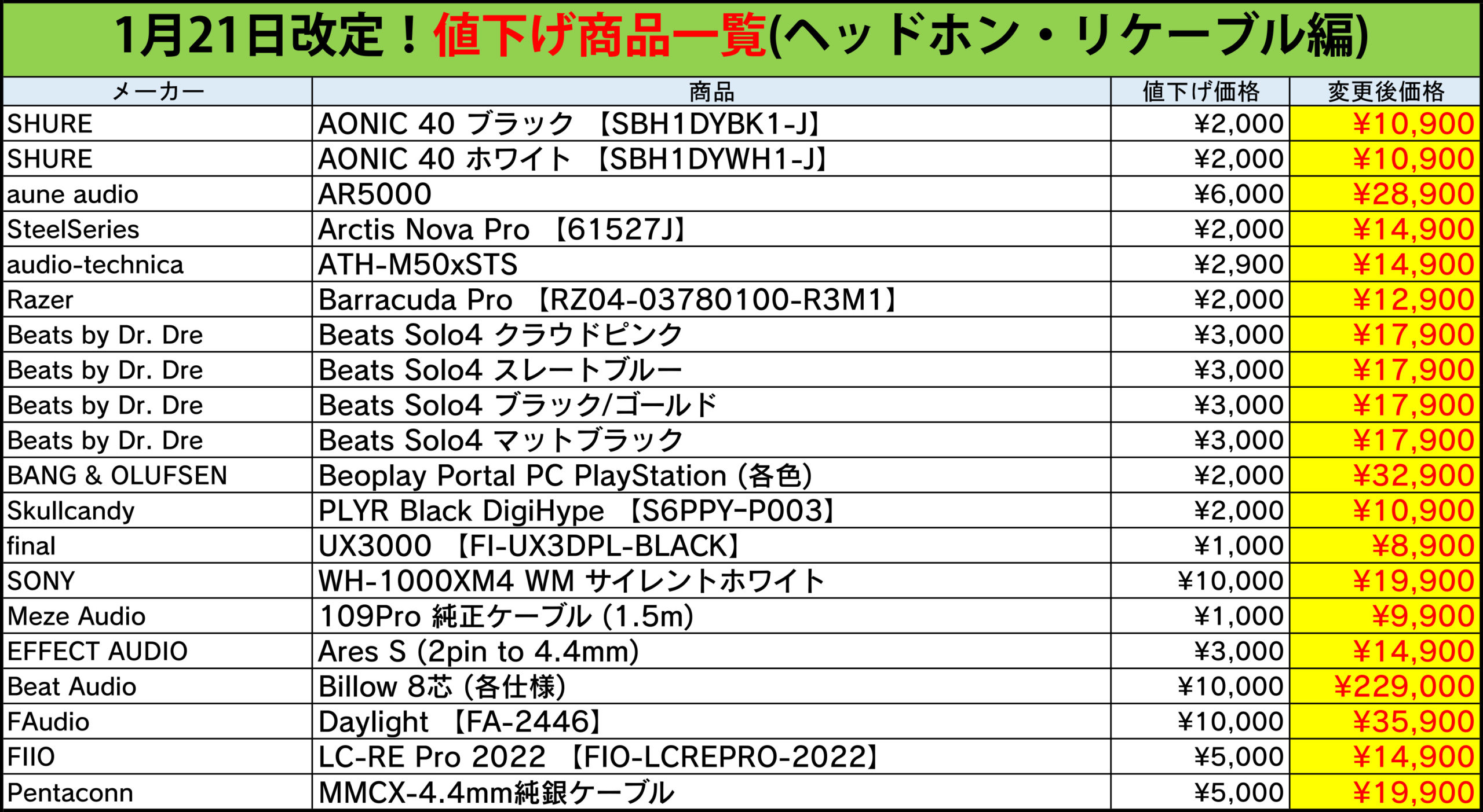 今回値下げされた製品一覧