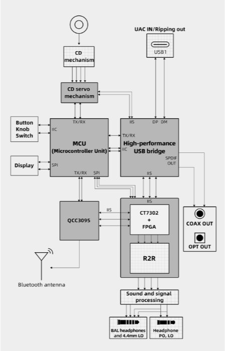 DM15 R2Rは、小型化と強力な機能性を融合させた画期的な製品です。ポータブルな筐体に、CDサーボ、USB DAC、R2Rモジュール、Bluetoothモジュールという5つのコアコンポーネントが詰め込まれており、すべてMCU(マイクロコントローラユニット)によって制御・連携されています。この徹底的な「コア」の進化によりあらゆる機能・性能がグレードアップし、同カテゴリー、同クラスの製品を凌駕しています。